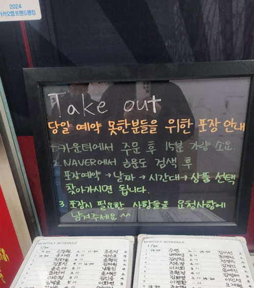 이 집의 기본 시스템은 100% 사전 예약이다. 온라인으로 예약하면 10분~20분 안에 들어갈 수 있다. 우리는 3일전에 예약을 했다. 다만 현장에서 테이크 아웃 포장은 기다리면 (카운터 주문 후 15분) 가능하다고 한다.